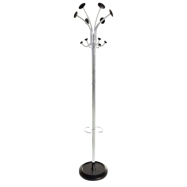 Gefertigt aus hochwertigem poliertem Stahl mit Chrom-Finish strahlt die Garderobe einen leichten Glanz und eine frische Optik aus. Der beschwerte Standfuß mit Kunststoffgehäuse sorgt für Stabilität, sodass die Garderobe fest an ihrem Platz bleibt.