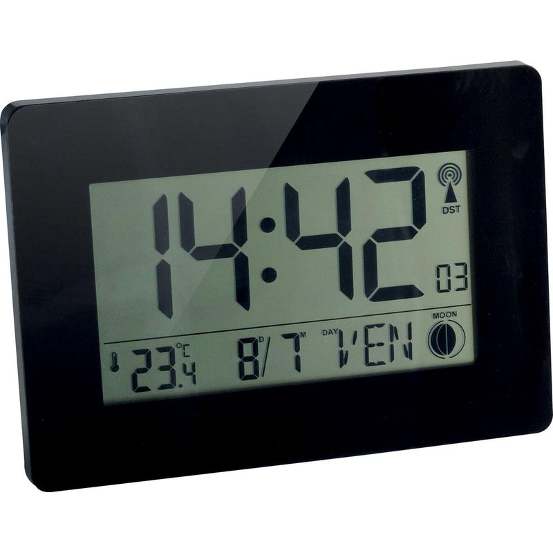 Funkgesteuerte Digitaluhr mit mehreren Funktionen. Gute Lesbarkeit dank der großen Zahlen. Schönes Finish mit glänzendem Trend. Tag, Datum und Stunde werden automatisch gesteuert und angepasst. Auswahl zwischen 7 Sprachen: Englisch, Deutsch, Französisch, Niederländisch, Dänisch, Spanisch und Italienisch. Verfügt über eine Alarmfunktion. Abmessungen: 22,9 x 2,7 x 16,2 cm. LCD-Bildschirm. Betrieb mit zwei Batterien: LR6 (im Lieferumfang enthalten).