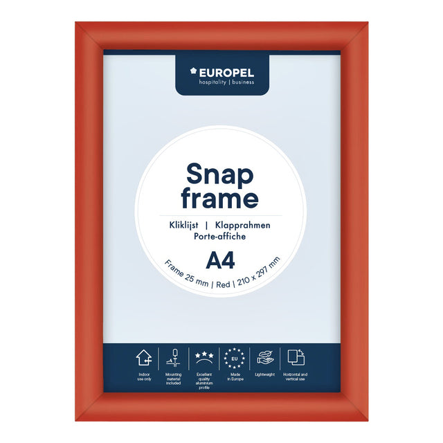 Geben Sie Ihren Plakaten eine stilvolle Bühne mit dem vielseitigen Europel Premium Aluminium-Klickrahmen. Dieser hochwertige Rahmen bietet eine schnelle und repräsentative Präsentation Ihrer A4-Plakate, ideal für Fluchtwege und Sicherheitsvorschriften. Der Klickrahmen ist in einem auffälligen roten Farbton gehalten und eignet sich perfekt für den Bürogebrauch.