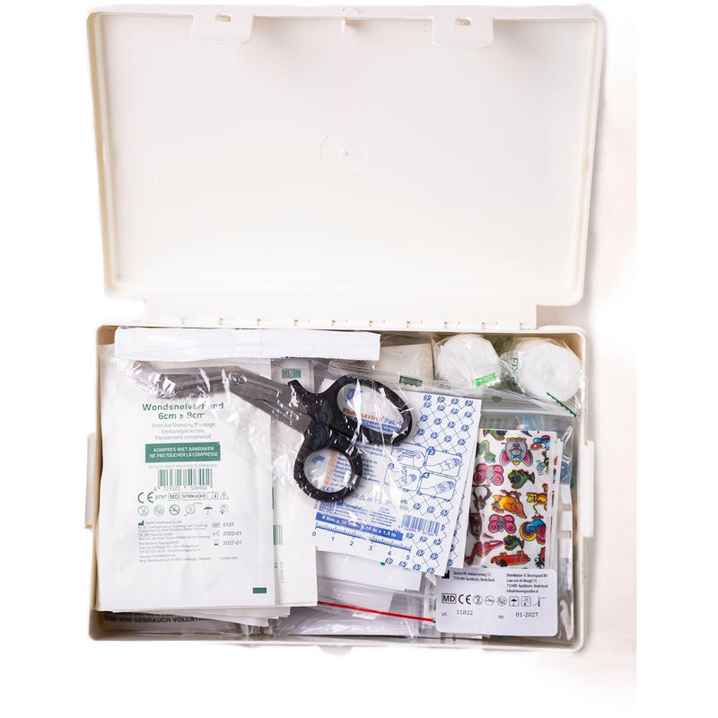 Inhalt: - 10 x Kinderpflaster 10 x 6 cm - 1 Wundschnellverband 6 x 8 cm - 1 gerollter Schnellverband 6 x 8 cm - 6 nicht haftende Kompresse 7,5 x 7,5 cm - 2 x Mullkompresse 1/16 - 2 x Mullkompresse 5 x 5 cm - 1 x Zeckenlöser - 1 x Splitter Pinzette - 1 x Verbandschere 14 cm - 1 x elastische hydrophile Binde 4 cm - 1 x elastische hydrophile Binde 6 cm - 1 x Sofort-Kühlpackung - 1 x Sortiment Kinderpflaster, 20 Stück - 1 x Desinfektionsmittel 30 ml - 1 x Universalbinde 6 cm - 1 x Wundpflaster ft 100 x 6 cm - 1 x Satz Einweghandschuhe, 2 Stück - 1 x selbstklebende Binde 6 cm - 1 x Kleber Verband ft 500 x 2,5 cm - 1 x Gesichtsmaske zur Beatmung - 1 x Rettungsdecke - 1 x Satz Klebestreifen, 10 Stück - 1 x Ablaufdiagramm - 3 x Brandbeutel 3,5 ml