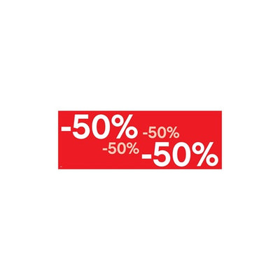 -50 % in Weiß und Rot können Sie mühelos die Aufmerksamkeit Ihrer Kunden auf sich ziehen. Dieser auffällige Fensterschein aus Papier mit den Maßen 69 x 24 cm ist ideal für die Werbung für Rabatte und Sonderangebote in Ihrem Geschäft oder Büro.
