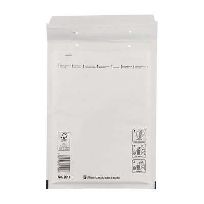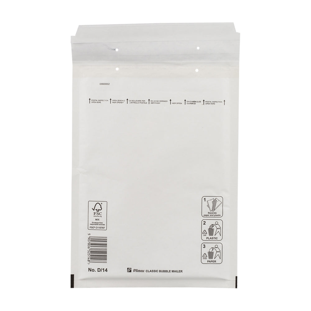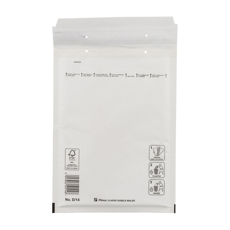 Versenden Sie Ihre Produkte sicher und geschützt mit den stabilen Luftpolsterumschlägen von VIV. Diese Umschläge bestehen aus hochwertigem weißem Kraftpapier und sind für optimale Stoßfestigkeit mit Luftpolsterfolie ausgekleidet. Mit einem Innenmaß von 180 x 265 mm (Nr. D/14) eignen sie sich perfekt für flachere Produkte. Verschließen Sie die Umschläge einfach mit dem selbstklebenden Verschluss, ohne dass zusätzliches Verpackungsmaterial erforderlich ist. Die Umschläge sind FSC