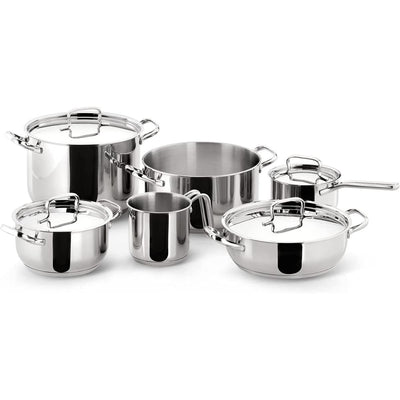 Aus Edelstahl. Spülmaschinenfest. Für alle Herdarten geeignet. 10-teiliges Set: - 1 x hoher Stieltopf, 22 cm - 1 x Stielkasserolle, 18 cm - 1 x Stielkasserolle, 22 cm - 1 x Schmorpfanne, 24 cm - 1 x Stielkasserolle, 14 cm - 1 x Milchtopf, 12 cm - 4 x Deckel, 14/18/22/24 cm