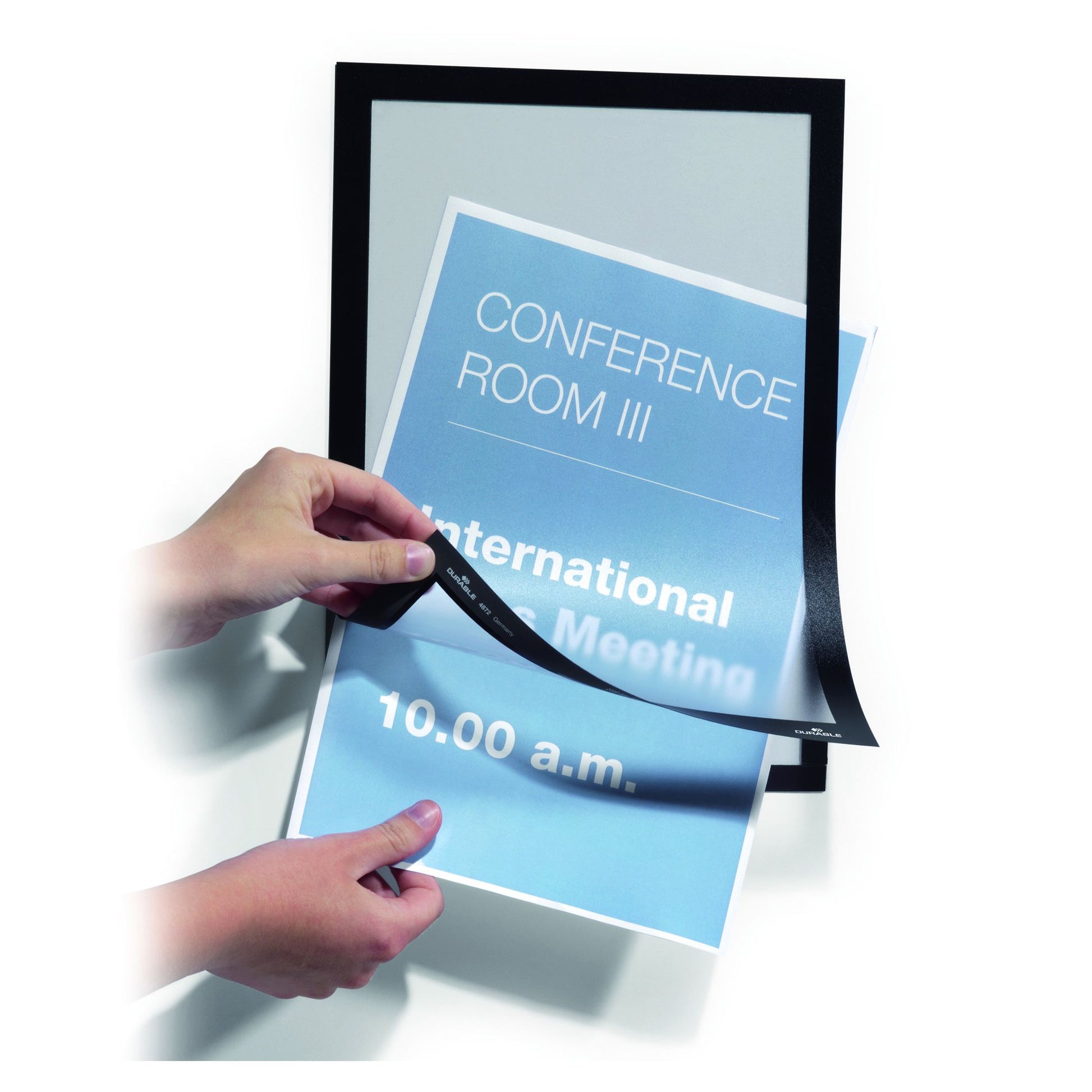 - Duraframe ist ein selbstklebender Rahmen, bestehend aus zwei transparenten Folien, die durch den magnetischen Rand zusammengehalten werden.