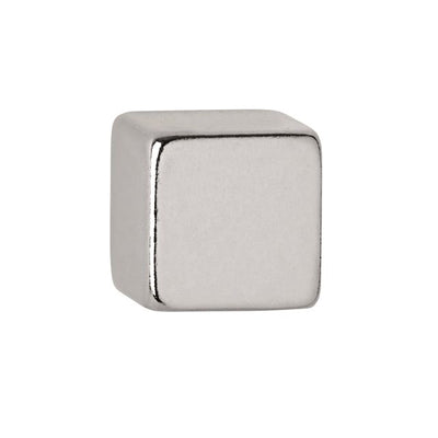 - Ästhetisch gestalteter Neodym-Würfelmagnet, schlanke Form und glatte Stahloberfläche, silberfarben, fügt sich dezent in die Umgebung ein.
