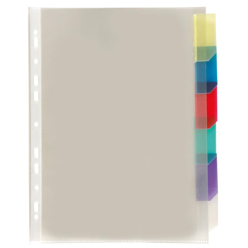 Fuß A4. Perforierte Showtasche aus 90 Mikron PP. Mit farbigen und personalisierbaren Reitern und Etiketten. 11-Loch-Perforation.