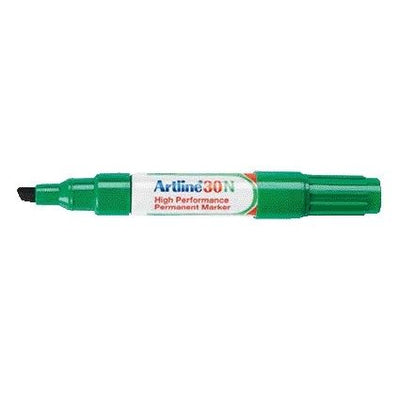- Le marqueur permanent Artline 30 vert a une pointe biseautée inclinée avec une largeur d'écriture de 2 à 5 mm.
