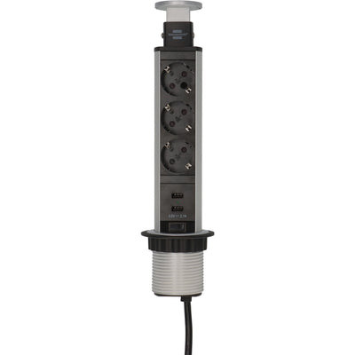 Prise de chargeur USB Tower Power à 3 voies avec mise à la terre et avec double entrée de charge USB 2 m H05VV-F 3G1.5 Complètement encastrée dans le plateau de table. Prise de courant pour installation permanente. Peut être encastré dans le bureau. Convient aux lieux de travail, cuisines, salles de loisirs, etc.