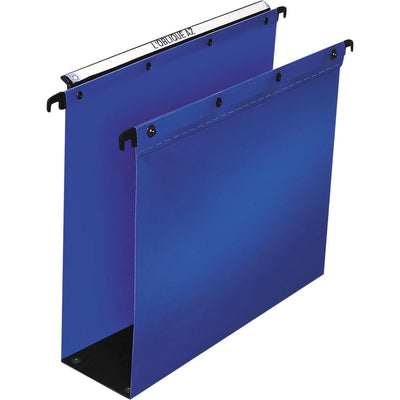 Pour ft A4 En PP indéchirable et résistant à l'usure Fond renforcé en PP nervuré Le dossier suspendu est fixé à la bande métallique de suspension à l'aide de rivets Peut être connecté grâce aux boutons poussoirs métalliques Espacement : 330 mm Capacité : 700 feuilles Fond 80 mm Couleur : bleu