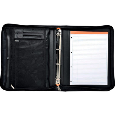 Fabriqué en PP robuste. Equipé d'un espace pour un bloc-notes ou un cahier A4, des cartes de visite, une pochette pour stylos et des compartiments pour classer des documents volants. Avec 4 anneaux. Avec poignée et fermeture éclair complète. Avec compartiment renforcé pour tablette. Couleur : noir. Pied 27 x 36 cm.