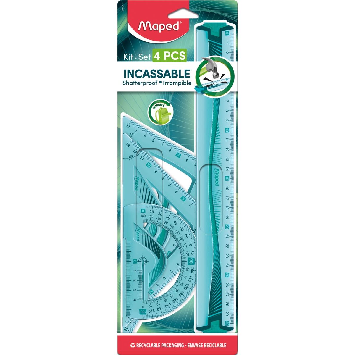 Set de dessin 4 pièces : 1 latte de 30 cm, 1 équerre 45°/21 cm, 1 équerre 60°/21 cm et 1 rapporteur 180°/12 cm. Latte composée de 2 matériaux (partie souple = anti-dérapant). Incassable. Couleurs assorties : bleu et vert.