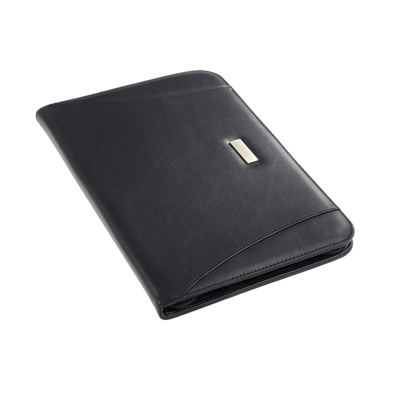 Le dossier peut être entièrement fermé avec une fermeture éclair, ce qui offre une sécurité et une protection supplémentaires à vos documents. Une plaque métallique est fixée à l'extérieur sur laquelle un texte ou un logo peut être appliqué par gravure laser, ce qui donne une touche personnelle à votre dossier d'écriture.