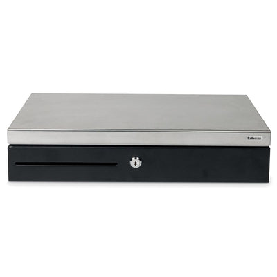 Boîtier métallique robuste et sécurisé Testé pour être ouvert au moins 1 million de fois Avec couvercle métallique Ouverture électrique et à clé Compartiment réglable et amovible pour 8 devises Contient 6 compartiments à billets réglables Fente d'écrémage pour stocker des billets et objets de valeur de grande valeur Compatible avec les imprimantes de reçus RJ12 et les systèmes de caisse enregistreuse (12V/24V) Serrure à 2 positions (fermée, veille et ouverte) Boîte d'insertion supplémentaire en option et couvercle verrouillable Ft 46 cm x 17 cm x 10 cm (l x p x h) Poids : 4,3 kg Tension : 12 V/24 V Certifié CE Garantie : 1 an
