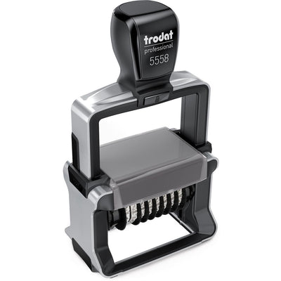 Trodat Professional 4.0 - le membre d'équipe optimal pour les professionnels du bureau, de la production ou de la logistique. 5558 Trodat Professional 4.0 - tampon à bande numérotée. Hauteur d'écriture des chiffres : 5 mm. Symboles par exemple : , $, #, Kg, /, X. Fabriqué en métal. Avec tampon encreur intégré. Certificat : Ecolabel Autrichien Matériau recyclé : 7,46%