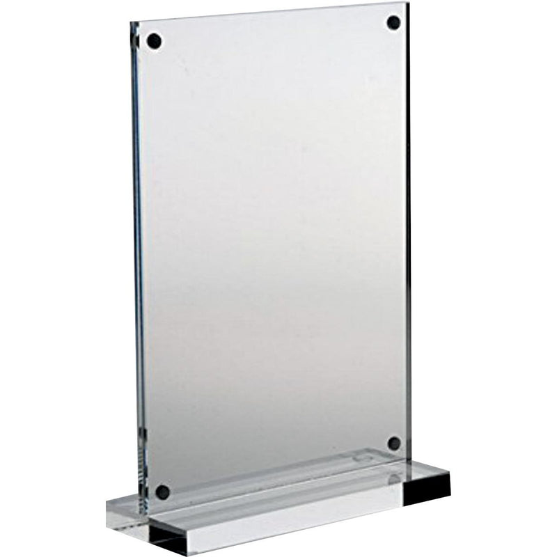 Display uit PMMA (2 x 3 mm) met een magnetisch systeem. Geschikt voor het presenteren van menukaarten, drankkaarten, brochures, enz. In T-vorm met een rechthoekige basis waarop de houder is vastgehecht.Makkelijk in elkaar te steken dankzij de magnetische sluiting.
