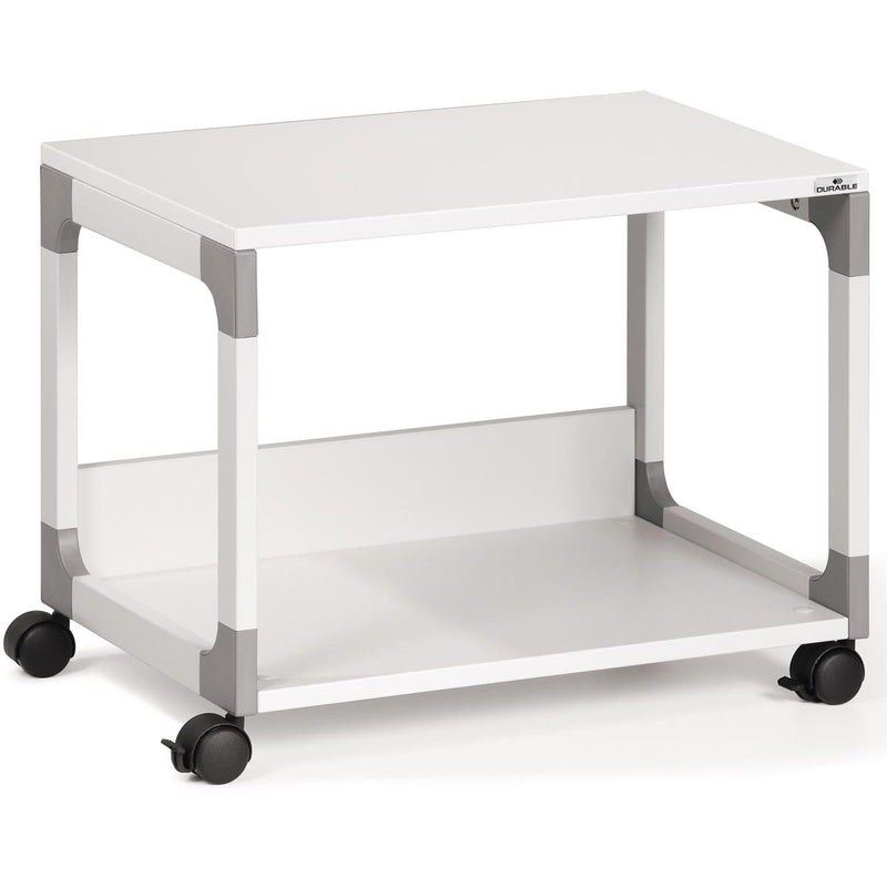 Gepoedercoat metalen frame met verstevigde kunststof hoeken Legplanken uit 19 mm dik hout, voorzien van een laag melamine De bovenste en de onderste legplank zijn vast Met 4 wielen, waarvan 2 met rem Kleur: grijs