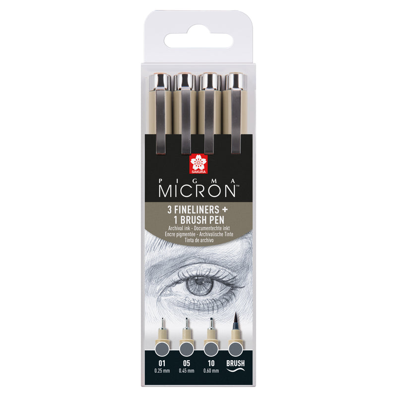 Selectie van 4 Koelgrijze Pigma Micron en Brush pennen: Pigma Micron 01 (0,25 mm), Pigma Micron 05 (0,45 mm), Pigma Micron 10 (0,60 mm) en Pigma Brush. Met deze opbouwbare grijstinten kun je schaduwen, diepte, visuele accenten en lagen toevoegen aan illustraties, tekeningen, bullet journal spreads en nog veel meer. Over Sakura Pigma Micron Pigma Micron is ’s werelds eerste professionele fineliner met gepigmenteerde inkt op waterbasis. Pigma inkt droogt snel, drukt niet door en droogt watervast op. Geschikt voor alle lichtgekleurde papieroppervlakken. De lange metalen punt maakt de fineliner ideaal voor gebruik met linealen en sjablonen.