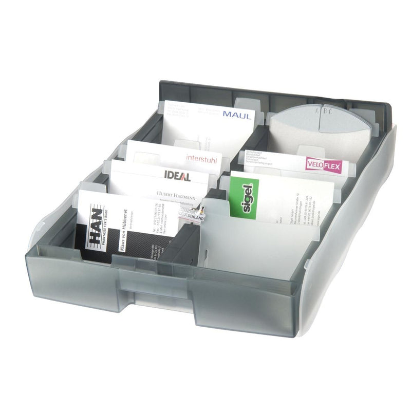 Capaciteit: 2.000 visitekaartjes. Bij opening glijdt het deksel onder de fichebak. Mogelijkheid om het deksel te personaliseren. Geleverd met 8 verzetbare indexen en een alfabetische index (16 stuks). Ft 21,5 x 30 x 6,8 cm. Kleur: transparant grijs.