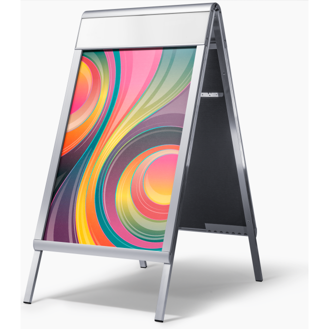 Met een posterformaat van 59,4x84 cm biedt het stoepbord voldoende ruimte voor opvallende visuele communicatie. De speciale invoer van de voorzetfolie en poster maakt het bord weerbestendiger dan andere modellen, waardoor het perfect is voor buitengebruik. De logoplaat aan de bovenkant biedt extra mogelijkheden voor branding en personalisatie.