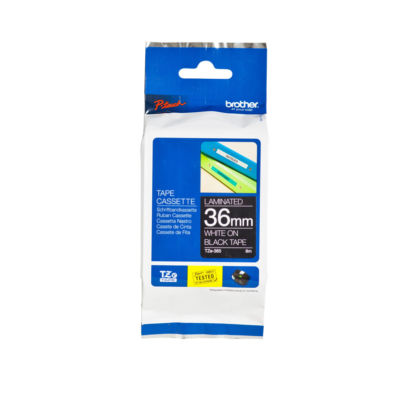 Deze originele gelamineerde TZe-365 labeltape is geschikt voor gebruik in diverse Brother P-touch labelprinters en bijzonder veelzijdig dankzij de goed leesbare wit op zwarte kleur – dus erg handig voor bij u thuis, op kantoor en op andere werkplekken.