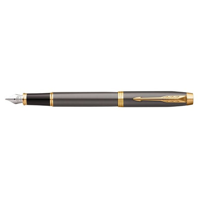 De Parker IM is ontworpen voor iedereen die waarde hecht aan kwaliteit en stijl in hun dagelijkse kantoorbenodigdheden. Deze pen, met zijn roestvrijstalen dop en houder, is prachtig afgewerkt in een klassieke grijze lak en voorzien van een goudkleurige PVD