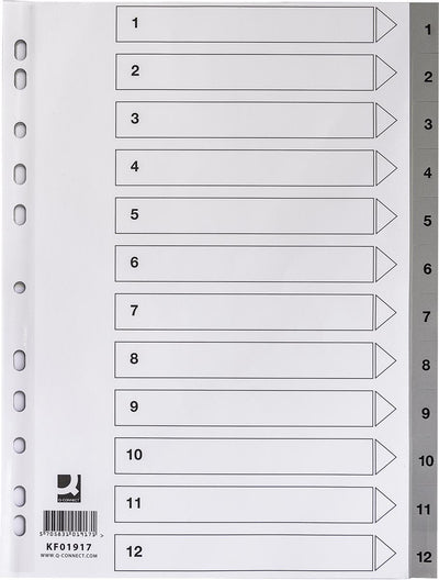 Q-CONNECT - tabbladen, A4, PP, 11-gaatsperforatie, met indexblad, set van 1-12, grijs